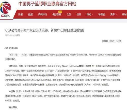 先来说一下CBA公司对广东男篮、新疆男篮的处罚情况。在今年六月份的时候,中国反兴奋剂中心公布了广东男篮外援吉伦沃特和新疆男篮外援哈雷尔兴奋剂违规的消息,随后CBA公司对此事进行了调查,引发了媒体和球迷的关注。就在日前,CBA公司发布官宣,表示对两名外援以及身属的两支球队进行处罚:吉伦沃特和哈雷尔都被禁赛了三个月,时间从2025年10月13日至2026年1月12日;广东男篮和新疆男篮分别承担三万六千元的兴奋剂检测费用,另外新赛季准入扣6分、相应核减俱乐部联赛经费人民币60万元。